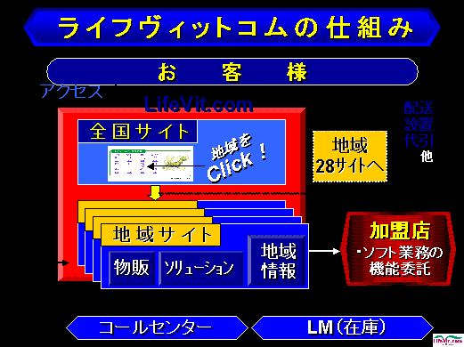 次にライフヴィットの仕組みですが、全国一律の運営ではありません。お客さまはライフヴィットのサイトに入りますと、全国サイトと28販社毎の地域サイトに入れるようになっています。ご注文されるとその情報は販社とコールセンターに入り、コールセンターが各地域のLM(ロジスティック・マネジメント=既存の物流センター)に問合せてOKなら加盟店へ配送される仕組みです。設置や保守などが必要な機器が相当あります。それだけに地域の販売店のソフト業務は不可欠ですし、単なるECではない付加価値を生むことになります。