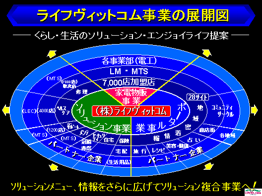 以上の考え方から、ライフヴィットコムのビジネス・コンセプトを定義しました。地域の人々の暮らしにあわせたソリューションとエンジョイライフを、加盟店・松下グループ・パートナー企業の3者によって、しかもそれをバーチャルとリアルの両面から提案・提供しながら実現していく。その総合プラットホームとしての役割をライフヴィットコムが果たす、ということです。