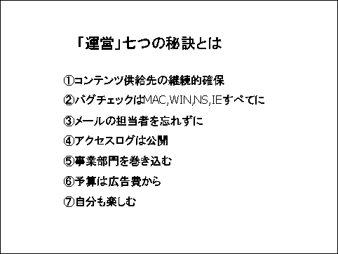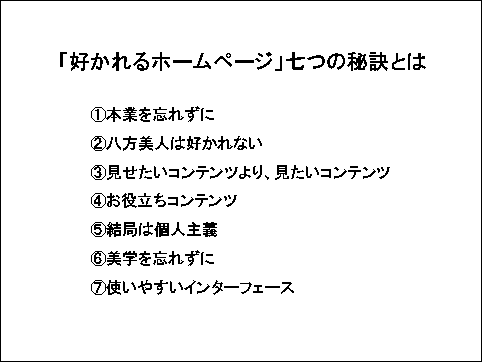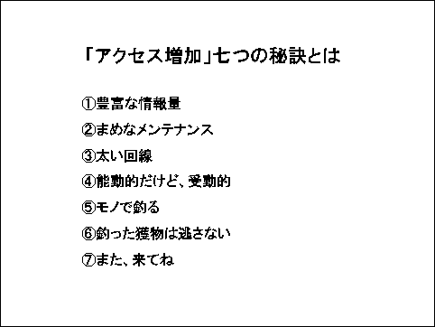 また、なぜホームページをもつのか、ということもよく考えるべきでしょう。無くても良い場合もある筈です。我々もやりながら分かってきたのですが、マスコミでは伝えきれない”魅力あるコンテンツを載せたい”、それをたくさんの人に見てもらいたい、つまり”集客したい”になり、その人たちの中から何人かでも個人情報をいただきたい、つまり”パーミションをいただきたい”、そのためのホームページなのだということです。