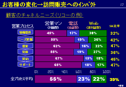 一方、2年前に全国5,000のお客様にアンケートをとったのですが、その中で新しい事実に驚きました。リコーの訪問販売に対するface to face のニーズは55%、逆に45%が対面でなく電話やWebでも良いという結果だったのです。この平均値は余り意味が無く、むしろ営業の各プロセス毎の数字に注目すべきでしょう。つまり営業だけ電話だけWebだけと言うのではなく組合せとウエイトの置き方が重要だと言うことが分かります。