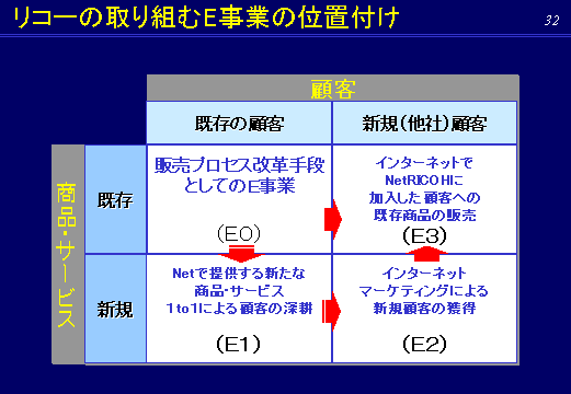 従ってリコーの取り組むE事業とは、販売構造の改革そのものであり、3つの課題、つまり