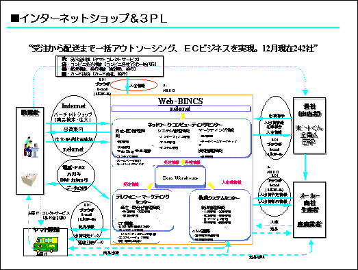 ヤマトのサービスをいくつかご紹介しましたが、これらのネットワークを総合したサービスとして「インターネットショップ&3PL」のご提案をしております。つまりeビジネスとして受注から配送までの一括アウトソーシングを請ける仕組みが出来ました。現在200数十社にご利用いただくまでになっています。