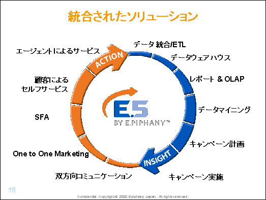 6年前にアメリカのシリコンバレーで誕生した会社です。MITのいわゆる天才系の何人かが集まって起こした企業の1つです。その後ITバブルで多くの会社が消えていく中、このCRM業界200社で生き残り10社の1つとして健闘しています。ものごとの本質・意味などを瞬時に直感・洞察することを英語で”epiphany”と言いますが、私どものソフトが顧客企業の顧客に対するリコメンデーションをひらめきのごとく実現する、という意味で社名になったようです。