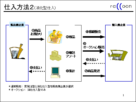 仕入れ方法は普通の受発注型仕入と消化型仕入の2つをとっています。消化型は商品をお預かりして検品・アソート・梱包を当方でやり、一気に掲載販売を掛けます。価格相場や地域情勢、小売店の好みなどデータ分析で手にとるように調べてありますから、出きるだけ高く、様々な企画でぶつけます。40000点位の衣料品なら3週間でさばけます。この消化型が売上の半分を占めるようになってきました。特に大手企業様向きのモデルです。既存流通との間で問題が起きないのかと言う方がおられますが、地方の普段取引も無かったような店のことなど、調べるだけでも大変です。570社との間でトラブルは開業以来皆無です。