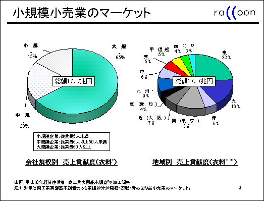 更に衣料品に限ってみると、小売総額17.7兆円の内、中小小売業が35%、東京・大阪・愛知を除く地方が60%を占めています(平成10年経済産業省)。決して小さくないマーケットを形成していることが分かります。